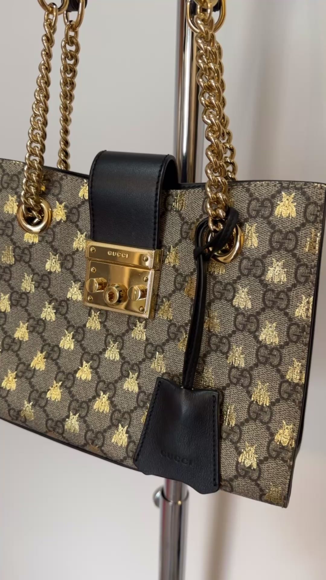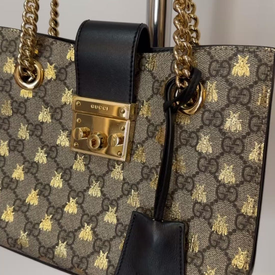 Step up your style with this stunning Gucci Padlock Small GG Supreme Bee shoulder tote — a timeless luxury piece that blends classic elegance with modern sophistication.